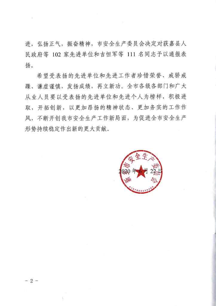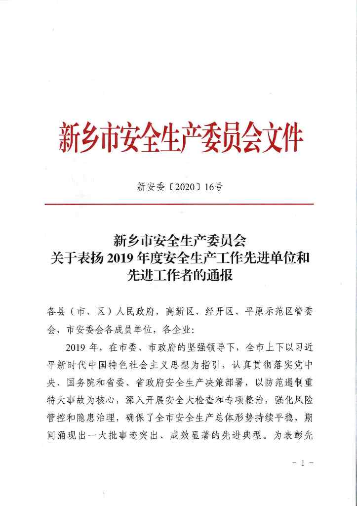 日前,從新鄉(xiāng)市安全生產(chǎn)委員會傳來消息,我公司被新鄉(xiāng)市安全生產(chǎn)委員會評為“2019年度安全生產(chǎn)工作先進(jìn)單位”。這一榮譽(yù)稱號的獲得,是對我公司安全生產(chǎn)工作的高度認(rèn)同和表揚(yáng)。