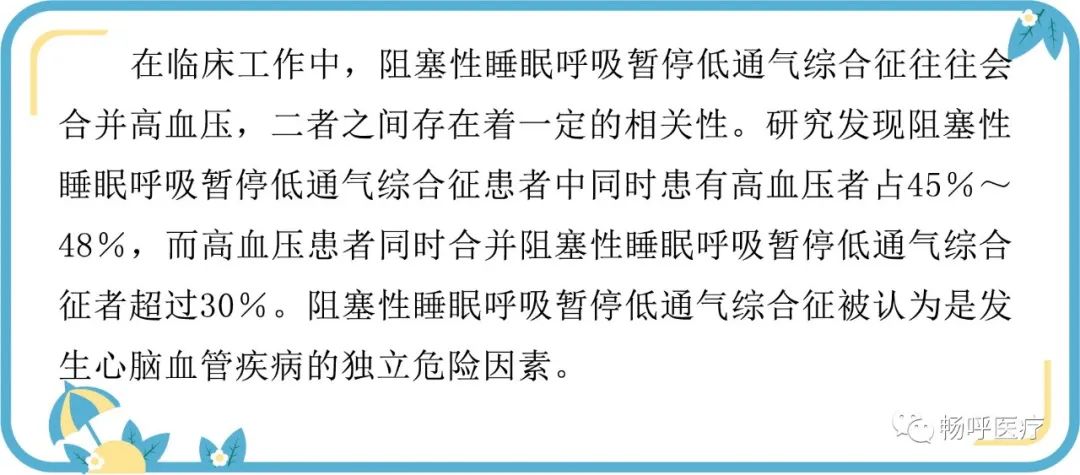 對(duì)于中、重度高血壓患者若其藥物聯(lián)合治療效果差時(shí)應(yīng)考慮是否為阻塞性睡眠呼吸暫停低通氣綜合征導(dǎo)致的血壓升高。當(dāng)治療了睡眠呼吸暫停低通氣綜合征,那么血壓也會(huì)得到非常良好的控制。