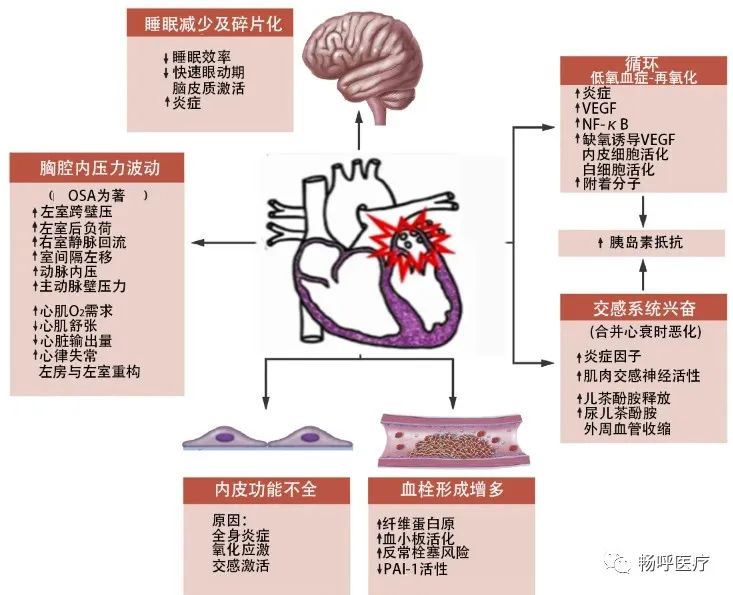 ①間斷低氧血癥及高碳酸血癥引起交感神經(jīng)活性增加,體內(nèi)腎素-血管緊張素Ⅱ-醛固酮系統(tǒng)激活,血漿兒茶酚胺水平升高,外周血管阻力加大從而導(dǎo)致高血壓。②OSAHS患者呼吸暫停低通氣指數(shù)升高、血氧飽和度降低,加速了血管內(nèi)皮細(xì)胞的凋亡,進(jìn)而損害血管內(nèi)皮依賴(lài)性舒血管物質(zhì)的功能,打破了舒血管物質(zhì)及縮血管物質(zhì)之間的平衡,引起血壓升高。③反復(fù)的缺氧激發(fā)了炎癥物質(zhì)的釋放以及氧化應(yīng)激的增強(qiáng),使血管內(nèi)皮破壞增加。④慢性間歇性低氧血癥通過(guò)興奮交感神經(jīng),刺激多種激素分泌,引起血糖增高、胰島素抵抗,使胰島素調(diào)節(jié)血管內(nèi)皮的舒張功能減弱。⑤此外,還有胸腔內(nèi)負(fù)壓增高所導(dǎo)致的機(jī)械效應(yīng)、遺傳以及年齡等諸多因素。