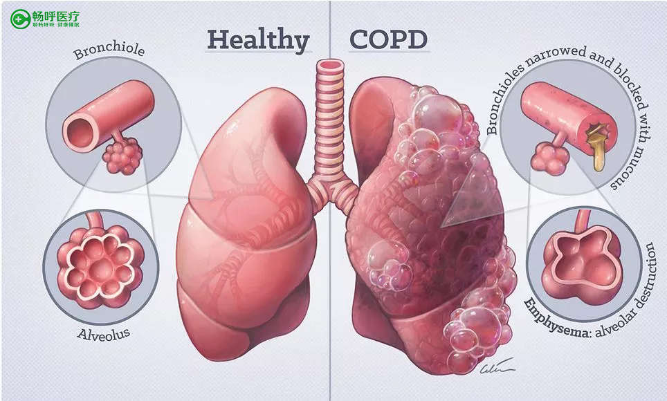 上圖是健康的肺和慢阻肺的一個對比,慢阻肺是因為小氣道堵塞導致氣流受限,因為小氣道堵塞,那么一部分氣體就會排不出去,長期會導致肺部膨脹,有些病人發(fā)展成肺氣腫也是這個原因導致的。當肺部膨脹之后我們的肺彈性就會降低,彈性降低就不利于進行氣體交換。同時肺部膨脹會壓縮膈肌的收縮空間,使膈肌扁變平。