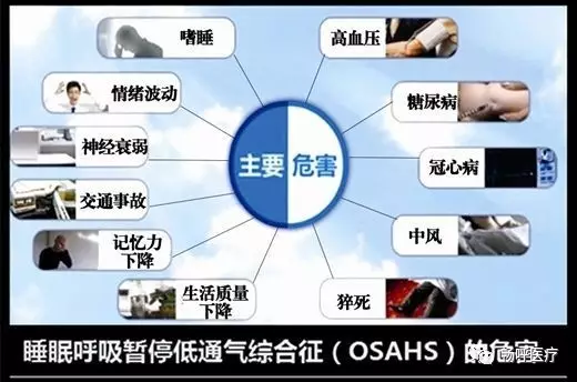 阻塞性睡眠呼吸暫停綜合征指打鼾的同時(shí)伴有憋氣和通氣不足,頻繁發(fā)生血氧飽和度下降。由于身體的缺氧,打鼾會(huì)對(duì)身體的各個(gè)器官造成影響。打鼾與高血壓、心臟病、糖尿病、肥胖癥、脂肪肝、酒精肝、性功能減退,就像一個(gè)個(gè)先后出生的“孿生兄弟”,嚴(yán)重摧殘著人的健康。