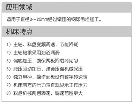 本機(jī)床系軸承廠和專業(yè)鋼球制造廠制造鋼球的初加工專用機(jī)床,適用于直徑3~25mm經(jīng)過鐓壓的鋼球毛坯。