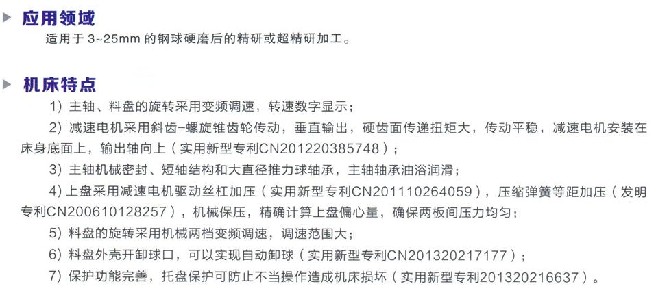 本機(jī)床是軸承廠和專業(yè)鋼球制造廠加工鋼球用的專用機(jī)床,適用于3~25mm的鋼球硬磨后的精研或超精研加工。(對(duì)于直徑3 mm ~5 mm的鋼球還可以進(jìn)行硬研加工以代替硬磨工序。)經(jīng)本機(jī)床加工后的鋼球精度可達(dá)G10~G5級(jí)。