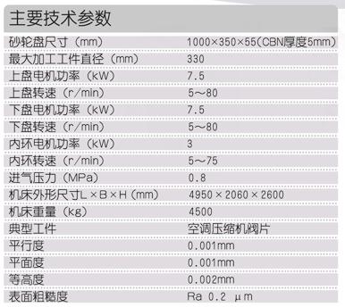 本機床采用立式布局,主機床身采用鑄鐵構件,減少加工時振動,確保加工精度。上、下研磨盤及內環(huán)均采用交流變頻無級調速,保證了研磨各種材料和各種形狀工件的工藝轉速。氣動控制實現(xiàn)上研磨盤擺入、擺出和上升、下降動作,便于操作。采用預壓、主壓、后壓三階段壓力控制,壓力值可任意調整并可自動轉換。